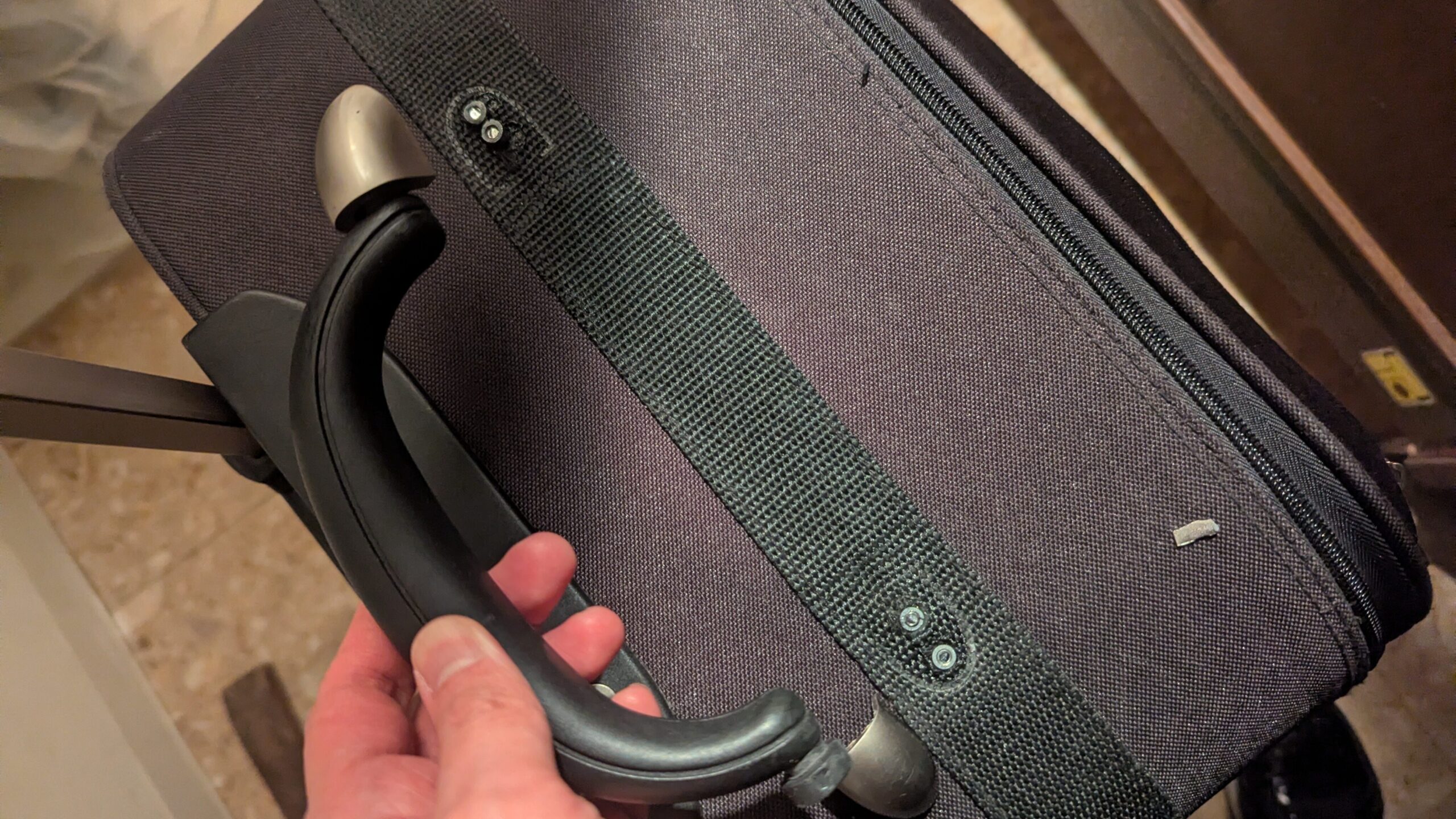 地面にはスーツケース、右手にはハンドル。「えっ!?ここ折れるの!?」 確かにパンパンに詰め込んだのでかなり重かった。車輪が壊れるのは想像できたけど、ハンドル折れるとは・・・。